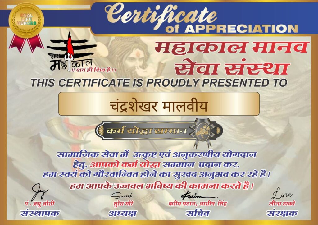 इंदौर के सामाजिक संस्था महाकाल मानव सेवा संस्थान द्वारा सामाजिक सेवा में उत्कृष्ट एवं अनुकरणीय योगदान के लिए चंद्रपुर के चंद्रशेखर मालवीय हुए सम्मानित