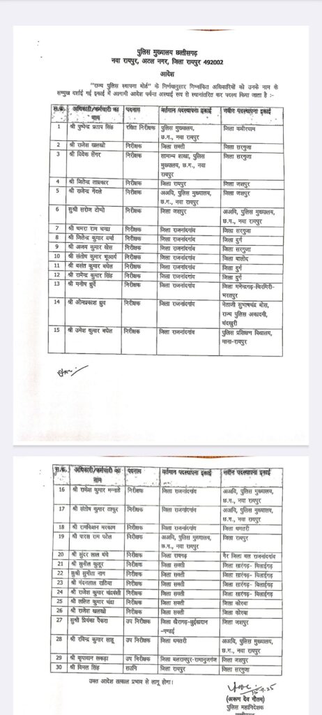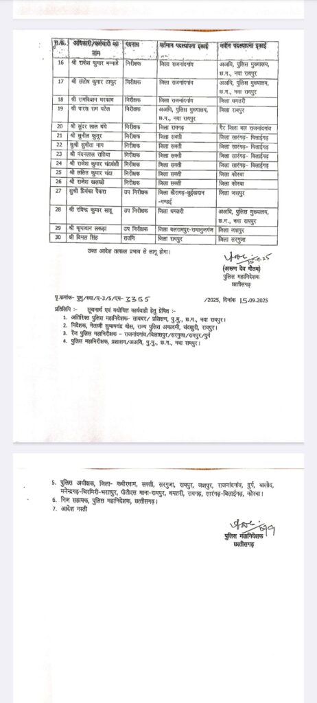 छत्तीसगढ़ में TI तबादला सूची जारीरायपुर: छत्तीसगढ़ सरकार ने पुलिस विभाग में बड़ा फेरबदल करते हुए TI (टाउन इंस्पेक्टर) की तबादला सूची जारी कर दी है। इस सूची में राज्य के कई थानों के प्रभारियों के नाम शामिल हैं, जिन्हें नई जिम्मेदारियां सौंपी गई हैं।