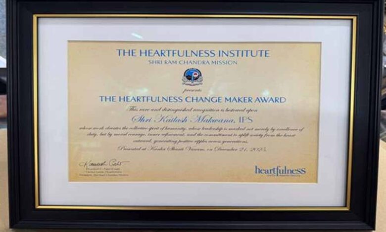 मध्यप्रदेश पुलिस में मानसिक स्वास्थ्य, तनाव प्रबंधन एवं संवेदनशील पुलिसिंग को सुदृढ़ करने की दिशा में किए गए दूरदर्शी प्रयासों के लिए पुलिस महानिदेशक श्री कैलाश मकवाणा को हार्टफुलनेस संस्था द्वारा ‘प्रथम हार्टफुलनेस चेंज मेकर अवार्ड’ से सम्मानित करने की घोषणा की गई। यह घोषणा हैदराबाद स्थित कान्हा शांतिवनम में आयोजित भव्य समारोह में भारत के माननीय उपराष्ट्रपति की गरिमामयी उपस्थिति में की गई।